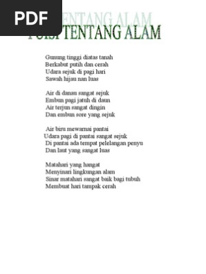 Dec 18 2020 Puisi Tentang Alam dan Lingkungan - Menulis puisi alam merupakan salah satu cara untuk mengungkapkan ketakjuban akan keindahan alam dan segala isinya. Berikut ini tersedia beberapa artikel yang menjelaskan secara lengkap tentang contoh kerangka karangan dengan tema keindahan alam. A short summary of this paper.