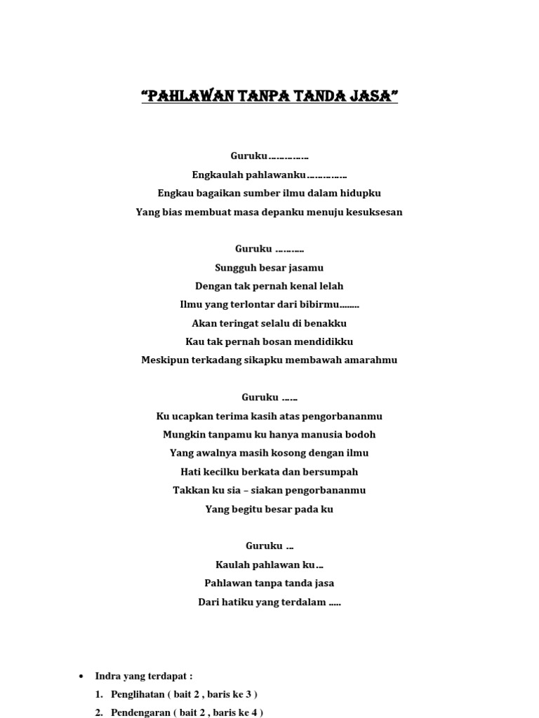 Selengkapnya baca di puisi guruku yang mulia mungkin masih perlu sedikit puisi guru beberapa bait lagi. 12 contoh puisi pahlawan 3 bait 4 baris puisi adalah suatu bentuk hasil pikiran dan perasaan manusia yang diwujudkan dalam bentuk deretan kata indah penuh dengan makna. Pergi tamasya ke surakarta baris 1 jangan lupa beli batik baris 2 manusia hidup di dunia baris 3 harus selalu berbuat baik baris 4 puisi baru balada.
