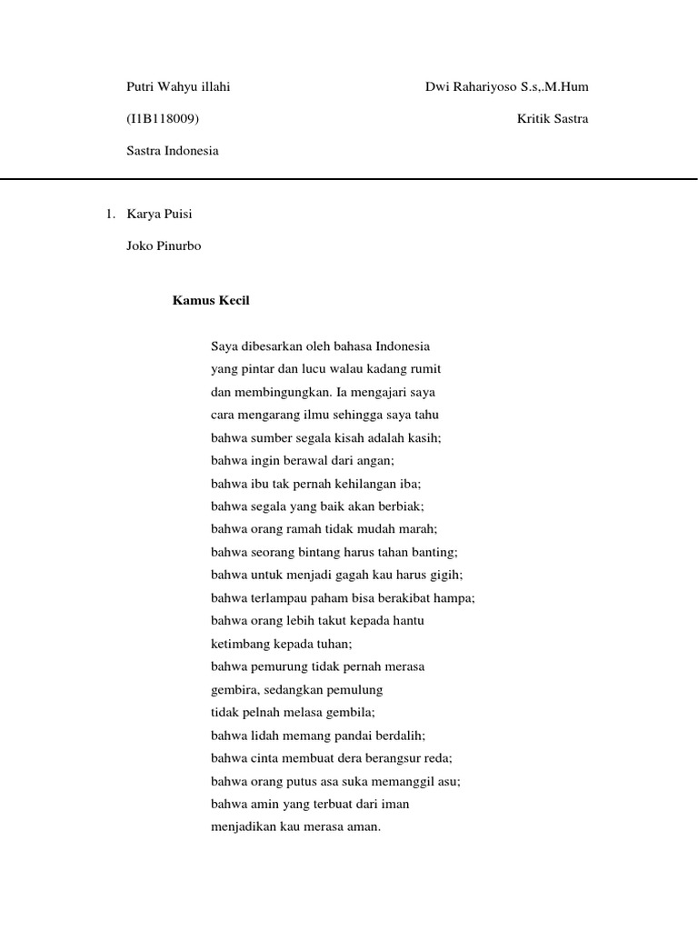 Dalam puisi Kamus kecil ini Joko Pinurbo seakan mencoba untuk merangkai sebuah kamus yang berisi kata dengan bentuk yang seolah-olah tapi saling berhubungan. Kamus Kecil Saya dibesarkan oleh bahasa Indonesia yang pintar dan lucu Walau kadang rumit dan membingungkan Ia mengajari saya cara mengarang ilmu Sehingga saya tahu Bahwa sumber segala kisah adalah kasih. Tidur karya Joko Pinurbo 311 Puisi Kamus Kecil KK Saya dibesarkan oleh bahasa Indonesia yang pintar dan lucu walau kadang rumit dan membingungkan.
