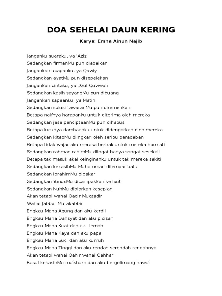Oleh Emha Ainun Nadjib Janganku suaraku ya Aziz Sedangkan firmanMupun diabaikan Jangankan ucapanku ya Qawiy Sedangkan ayatMupun disepelekan Jangankan cintaku ya Dzul Quwwah Sedangkan kasih sayangMupun dibuang. Aug 23 2020 Tentang Puisi dan Penulis-Budayawan Emha Ainun Nadjib atau yang akrab dipanggil Cak Nun lahir di Jombang Jawa Timur 27 Mei 1953 mengaku seorang pelayanSuami Novia Kolopaking dan pimpinan Grup Musik Kyai Kanjeng itu memang dalam berbagai kegiatannya lebih bersifat melayani yang merangkum dan memadukan dinamika kesenian agama pendidikan politik dan. Aku sendirilah yang menggerakkan laku.
