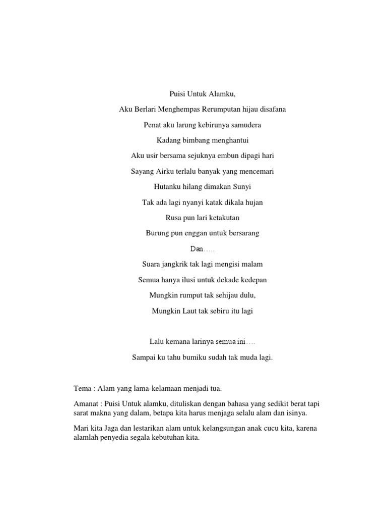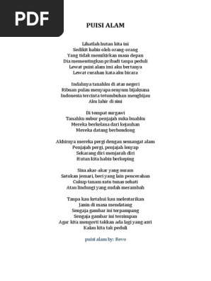 Oct 19 2017 Ada berbagai macam puisi alam yang menceritakan tentang keindahan alam semesta namun terkadang juga banyak di jumpai puisi yang mengkritik tentang kerusakan alam. Tulisan-tulisan berupa syair sajak dan puisi alam juga dapat menyampaikan. Puisi tentang alam tadi ditulis sebagai bentuk kesedihan penulis terhadap bencana gempa yang terjadi di Lombok dan Bali pada Agustus 2018.