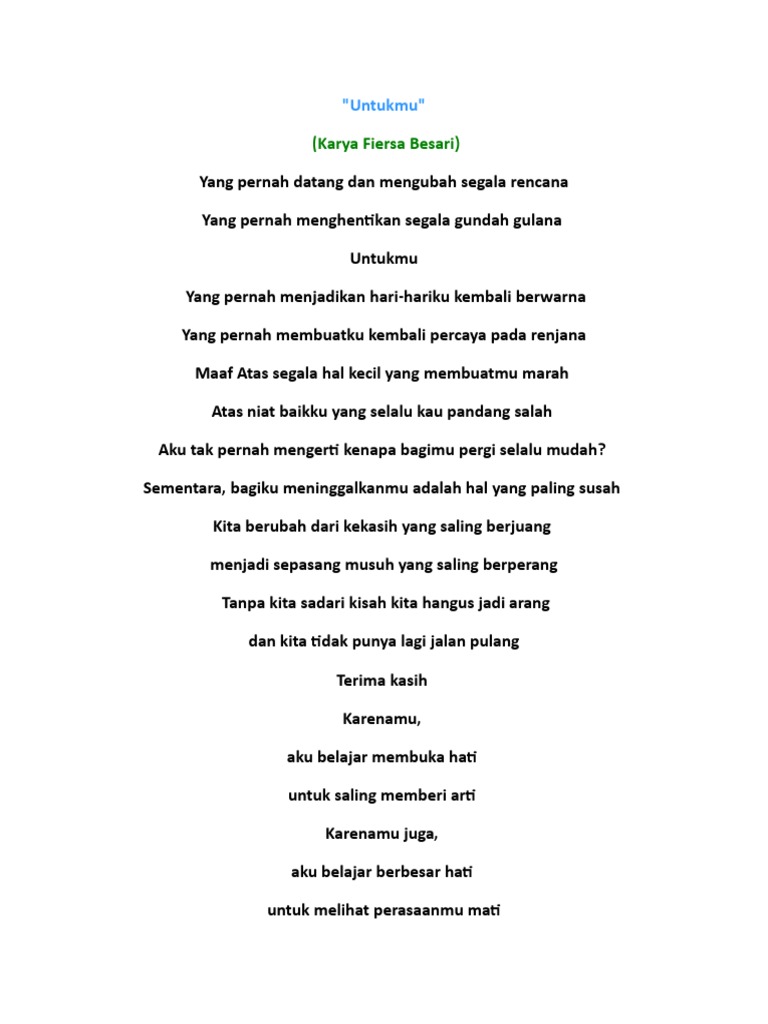 Puisi untukmu karya fiersa besari. Beberapa judul buku yang telah diterbitkannya antara lain adalah. Baca puisi-puisi karya orang lain misalnya dari sastrawan yang sudah termasyhur seperti Sapardi Djoko Damono Hujan Bulan JuniChairil Anwar Doa Taufiq Ismail Dengan Puisi Aku Fiersa Besari Garis Waktu dll. Puisi Ketika Kukira Aku Istimewa Karya Fiersa Besari Puisi Sepasang Karya Fiersa Besari Puisi Garis Waktu Karya Fiersa Besari Puisi Kalau Saja Aku Mampu Karya Fiersa Besari.