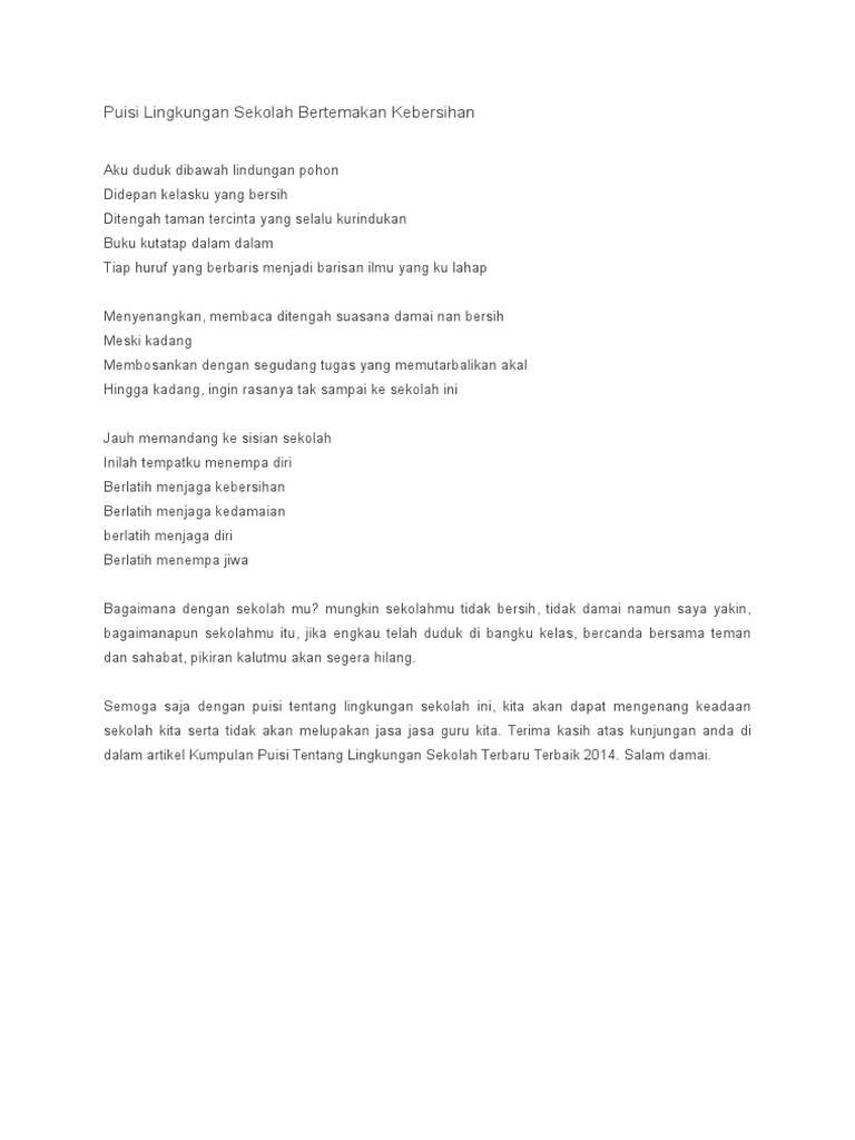 5 contoh puisi tentang lingkungan sekolah puisi merupakan suatu karya sastra yang mencurahkan segala ide atau ungkapan perasaan penyair dalam bentuk tulisan dengan pemilihan kata kata yang diindahkan. Sebelum mempelajari contoh puisi tema kebersihan sobat harus tahu dulu tata cara membuat puisi untuk mengetahu cara membuat puisi sobat bisa cari pada form pencarian di sudut kanan atas halaman ini. Puisi kebersihan lingkungan sekolah.