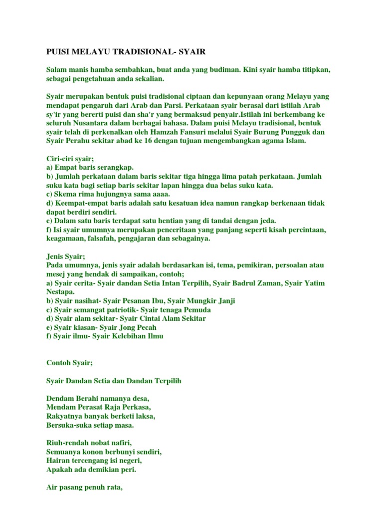 Puisi adalah karya yang fungsi estetiknya dominan. Bila dibaca sekilas kita akan menilai puisi Kau adalah sebuah puisi cinta. Yang termasuk puisi lama adalah.