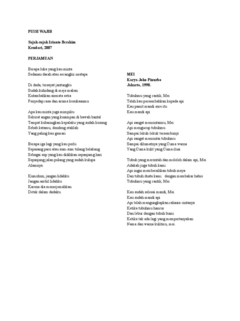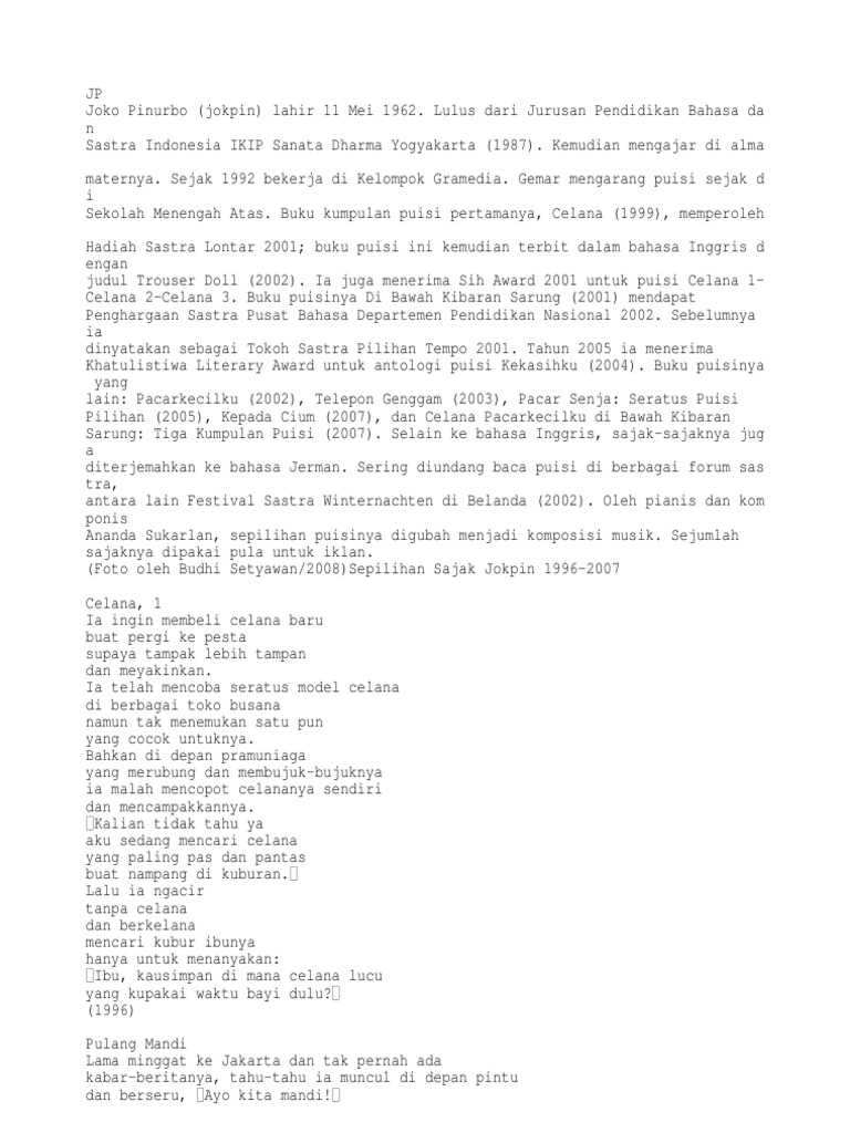 Lihat pos aslinya 412 kata lagi. Mei Joko Pinurbo 2000 Melalui puisi ini Joko Pinurbo mengabadikan ingatannya tentang kekejaman yang terjadi pada etnis Tionghoa. Puluhan karyanya yang menggelitik dan romantis menjadikan puisi Jokpin sangat digemari kawula muda.