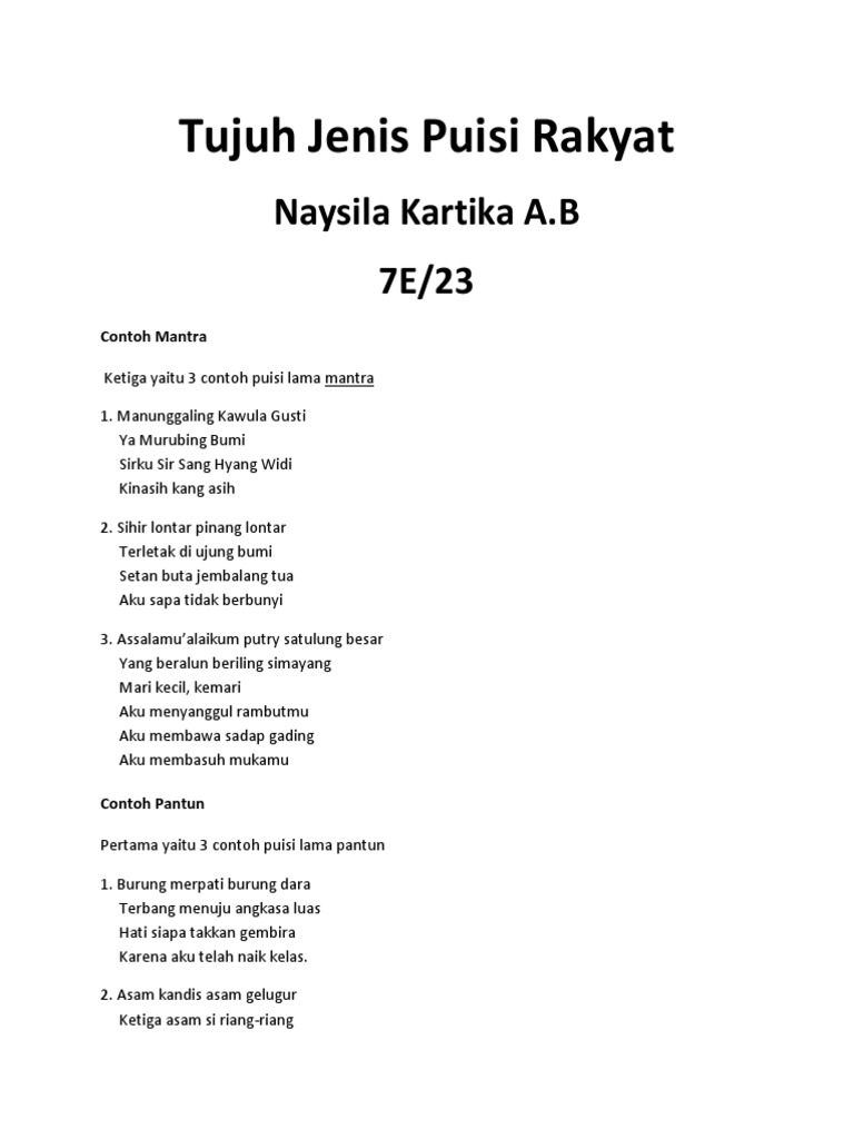 Puisi rakyat atau yang dikenal sebagai puisi lama terbagi menjadi beberpa jenis antara lain. Puisi rakyat puisi lama merupakan karya sastra lama dari warisan budaya bangsa yang sudah tak dikenal pengarangnya. Umumnya puisi rakyat terdiri dari beberapa kalimat ada yang berdasarkan kepercayaan rakyat atau mantra dan rarakitan cerita rakyat lemah tekanan suara panjang pendek suku kata panjang dan pendek suku kata isi serta iramanya.