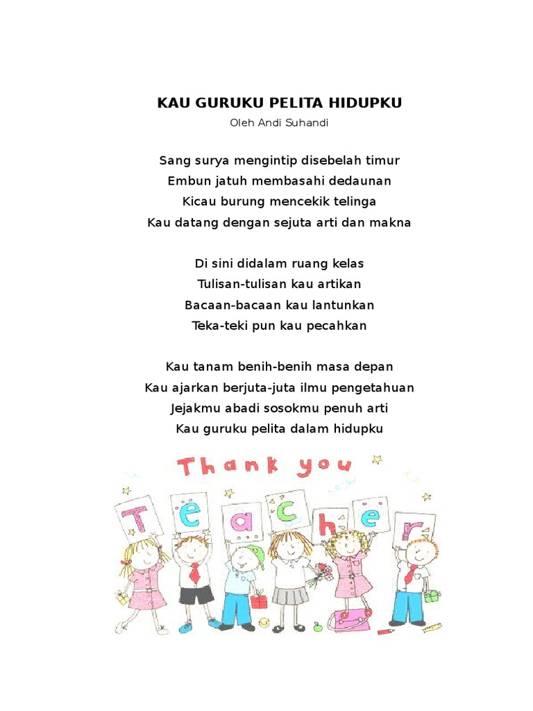 Unsplash Dengan letih kau mengajariku Dengan sabar kau mengajariku Dengan hati kau mengajariku Dengan senyum kau mengajariku. Bahkan mereka rela mencerdaskan anak bangsa meskipun jasanya tak pernah dipandang. Tanpa ilmu kita tidak akan bisa menjalankan kehidupan yang sejahtera.