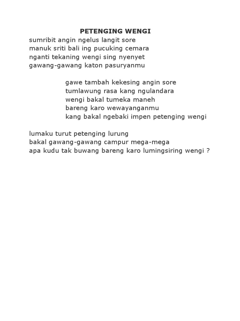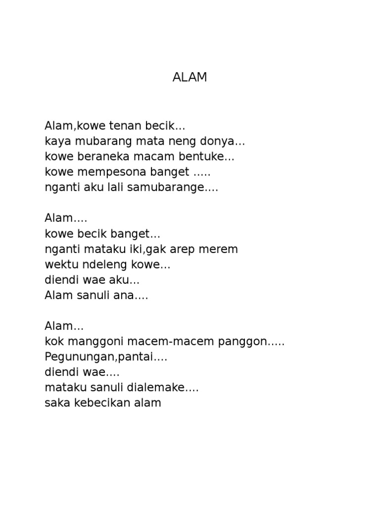 Kanggo Kanca Biyen tanganmu genggem tanganku Biyen pundakmu enek kanggo aku nangis Biyen guyumu nentremke atiku Nanging saiki. Puisi bahasa Jawa memang menjadi salah satu bahan ajar yang diajarkan di berbagai sekolah tentu terutama di Jawa terkhusus daerah Yogyakarta Jawa Tengah dan Jawa Timur. Lomba itu diberi tajuk atau tema Aku Cinta Jawa Tengah.
