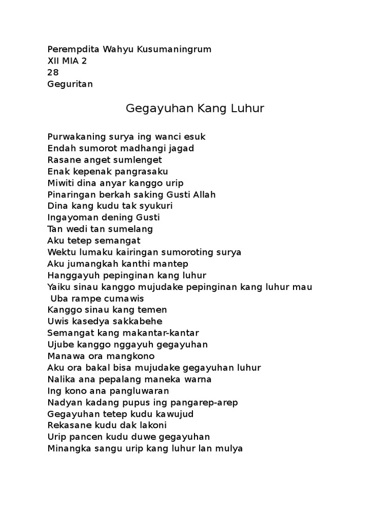 Ya saat di sekolah Kamu pasti pernah mendapatkan pelajaran tentang hal ini. Puisi Jawa yang berkembang pada saat ini yang lebih bersifat bebas dan memiliki tipografi yang bebas. Pemakaian bahasa Jawa dalam geguritan diharapkan mampu memasyarakat budaya Jawa kepada masyarakat masa kini dan masa depan.